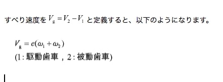 上式から、ピッチ点においては、e=0ですため、Vg=0となります。ピッチ点から離れるにしたがって、eの絶対値が大きくなるため、すべり速度も増大していきます。このため、すべり速度はかみ合い始めと終わりで最大となります。